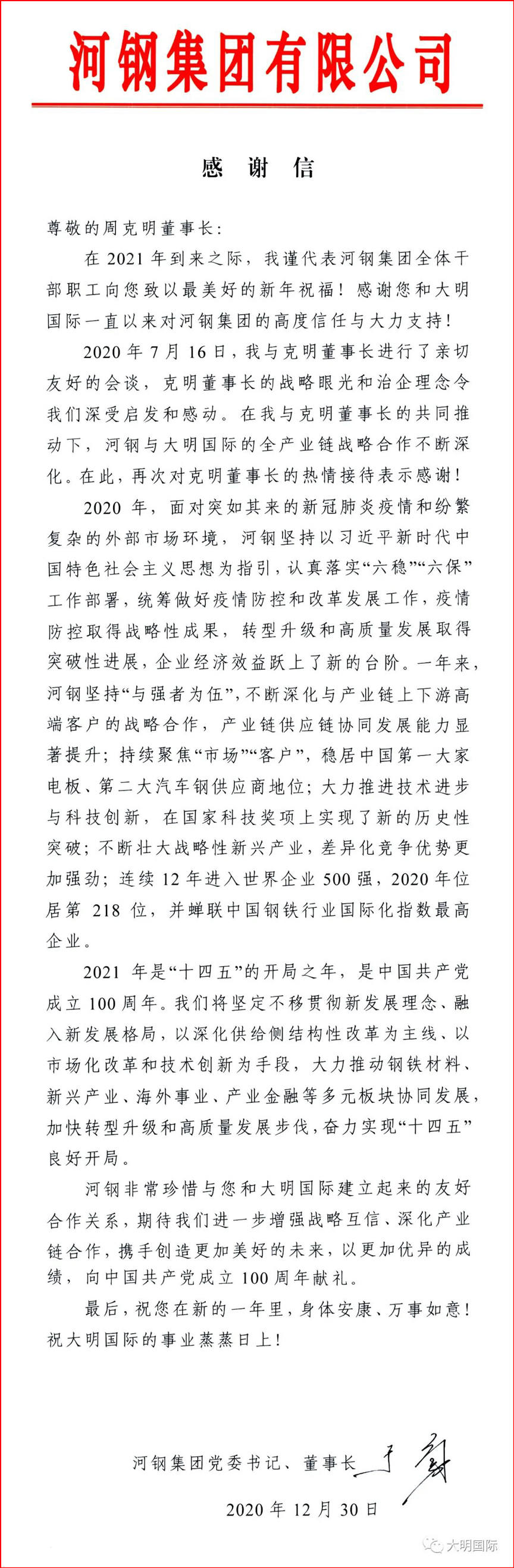 2021年新年之際,于勇董事長(zhǎng)特致信大明國(guó)際,對(duì)雙方全產(chǎn)業(yè)鏈戰(zhàn)略合作所取得的成功給予了肯定,并希望進(jìn)一步增強(qiáng)戰(zhàn)略互信、深化產(chǎn)業(yè)鏈合作、攜手共創(chuàng)。大明國(guó)際將繼續(xù)一如既往地與河鋼合作推進(jìn)重大工程項(xiàng)目,戰(zhàn)略客戶服務(wù),為客戶協(xié)同創(chuàng)造價(jià)值,強(qiáng)化“鋼廠—大明—客戶”產(chǎn)業(yè)鏈合作模式。