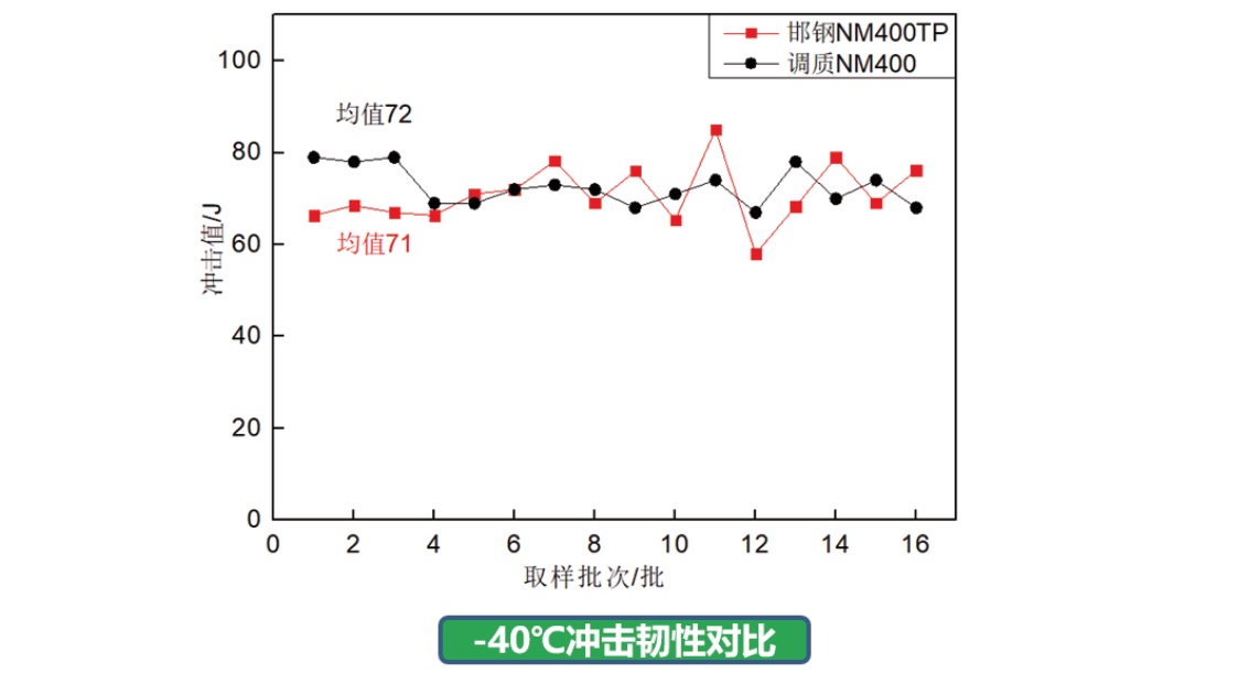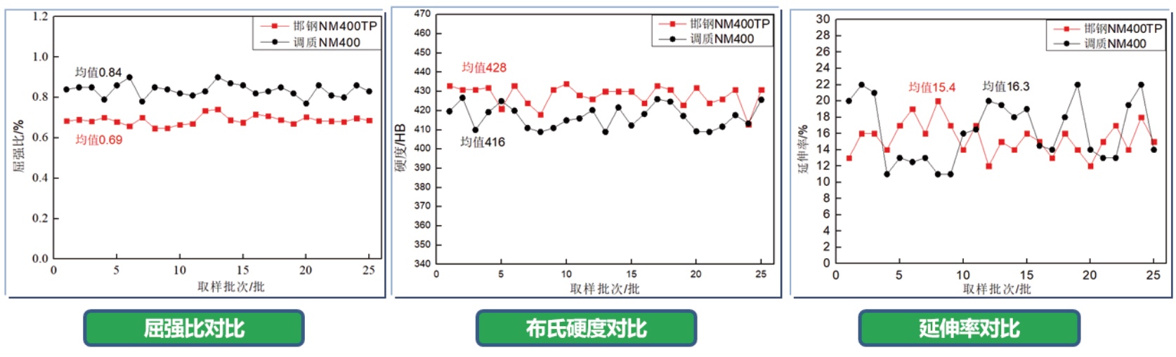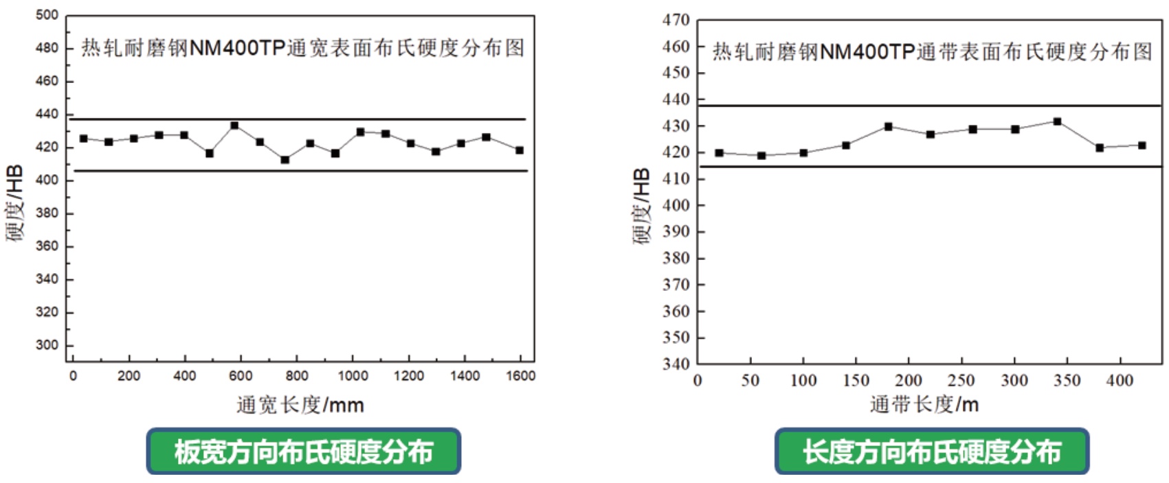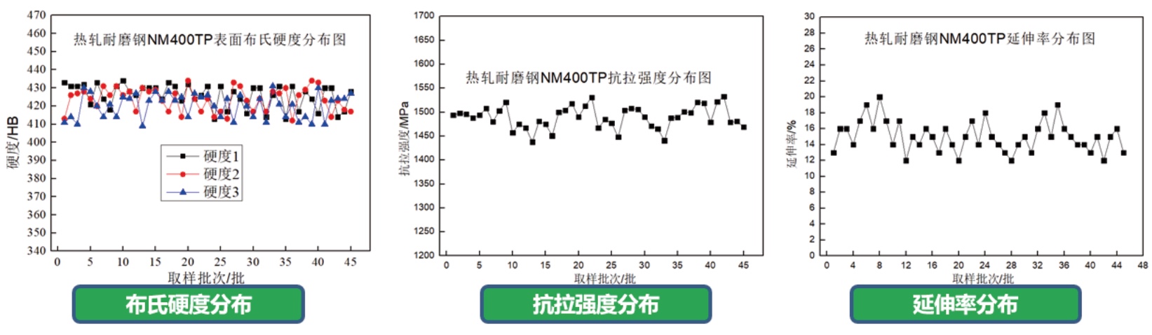 NM400TP性能分布情況(45個批次):布氏硬度高度均勻,波動<±15HBW,均勻磨損,保證使用壽命??估瓘?qiáng)度≥1400MPa,延伸率>11%,保證馬氏體超高強(qiáng)耐磨鋼的加工、成型性能。
